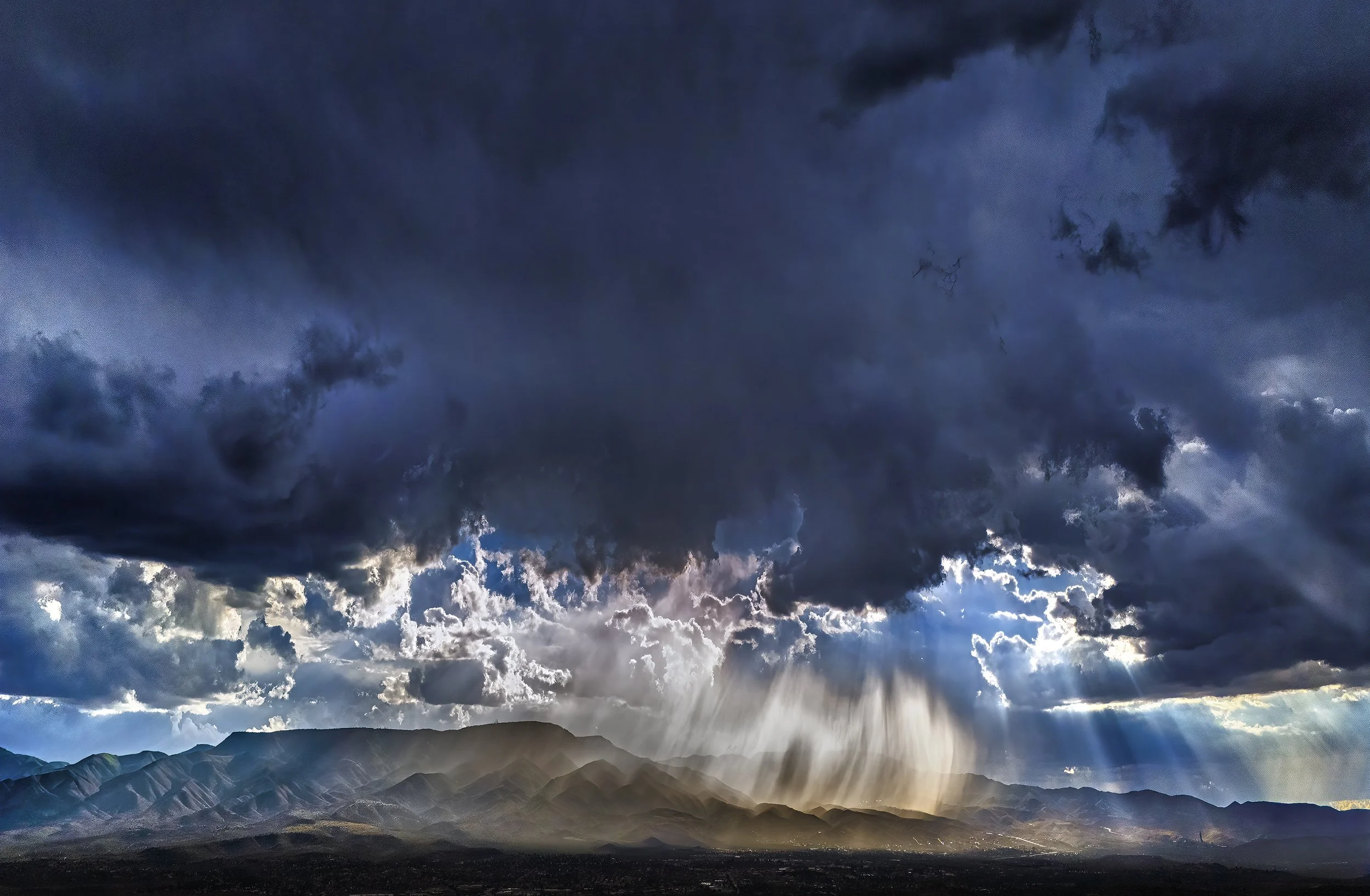 Dark storm clouds over red rock formations and green desert vegetation in a mountainous landscape.