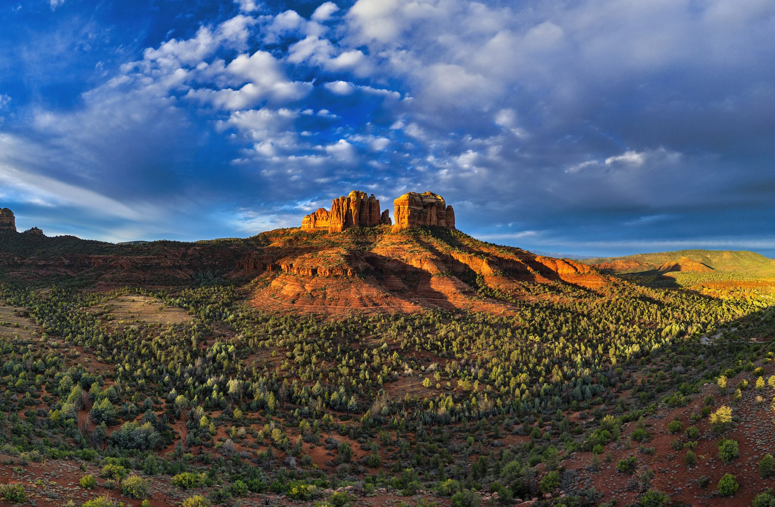 Sunset over west Sedona Boynton canyon area landscape with red rock cliffs and sparse vegetation.